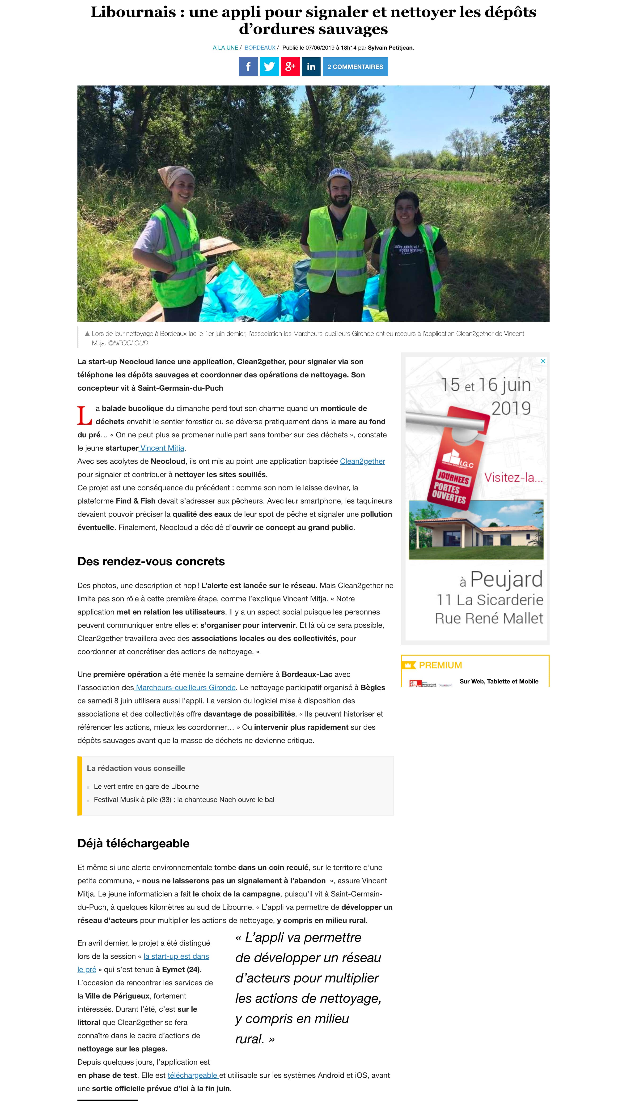 Clean2gether dans le Sud Ouest !Par Clean4green / 28/06/2019 PartagezÉpingleTweetezPartagez0 Partages Découvrez l’article publié sur le site Internet du Sud Ouest le 7 juin 2019 par Sylvain Petitjean. L’article met en avant la collecte de déchets organisée par les Marcheurs cueilleurs 33, effectuée le 1 juin à Bruges. Bonne lecture 🙂 PartagezÉpingleTweetezPartagez0 Partages
