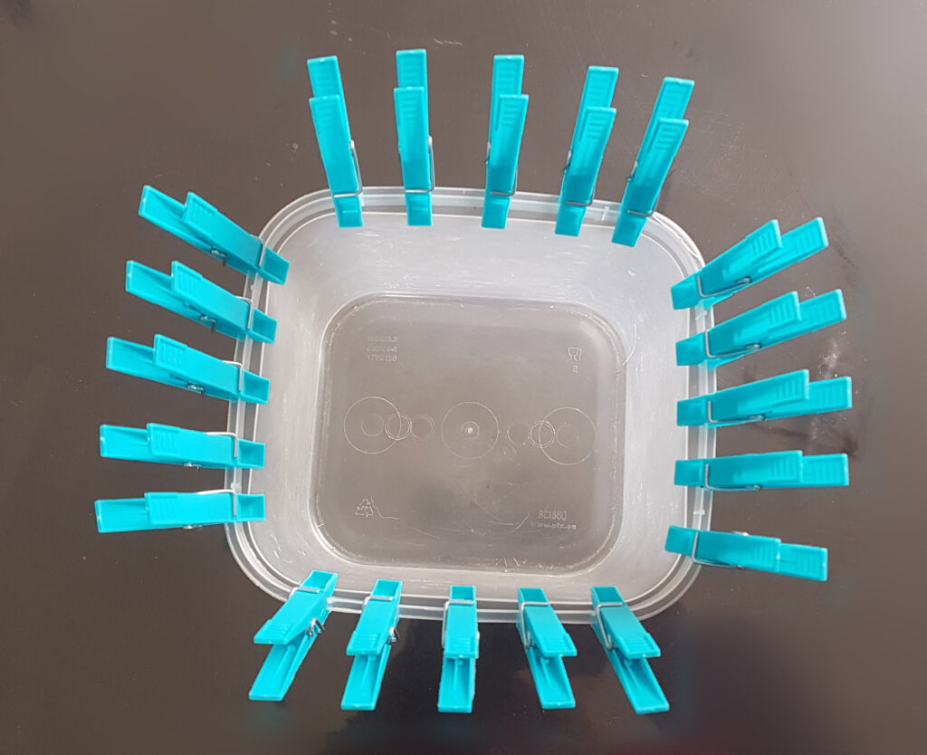 ♦ Vous pouvez remplacer le récipient en plastique et les épingles à linge par une planche en bois munie de 20 clous disposés de la même façon que les épingles ;