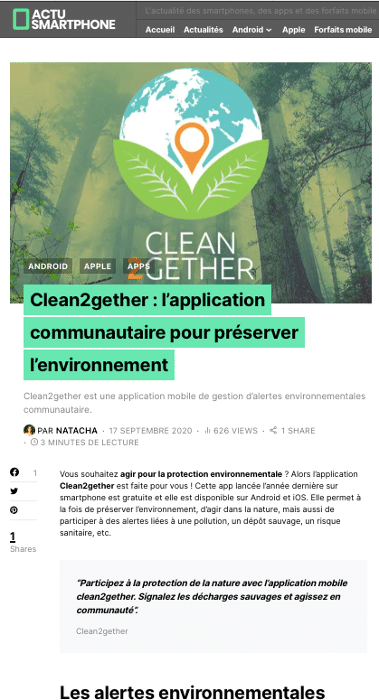 Le 17 septembre 2020, nous avons eu le plaisir de voir que l’application Clean2gether a été citée dans l’article du site Actusmartphone : “ Clean2gether : l’application communautaire pour préserver l’environnement “ publié par Natacha.
