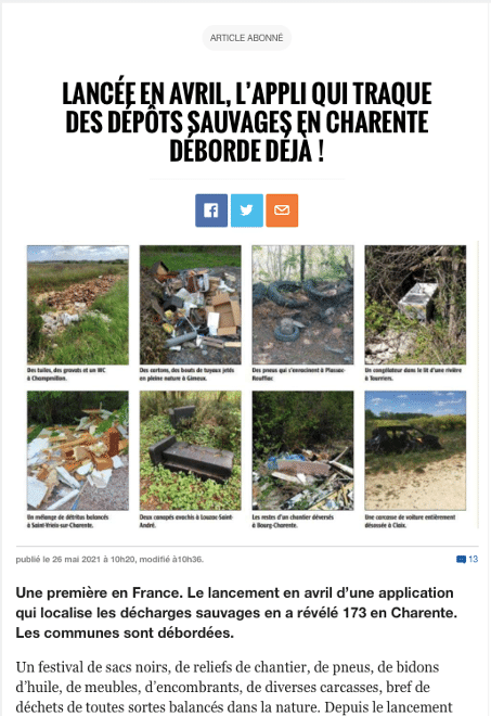 L’article évoque l’utilisation de l’application Clean2gether et les 173 signalements qu’elle a réalisés au sein de la Charente. Alors venez le découvrir, et nous découvrir, au travers de ces quelques lignes.