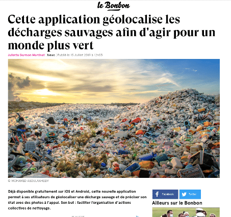 Le 15 juillet 2019, nous avons eu le plaisir de voir que l’application Clean2gether a été citée dans l’article du site lebonbon :  Cette application géolocalise les décharges sauvages afin d’agir pour un monde plus vert publié par Juliette Darmon Martinet.