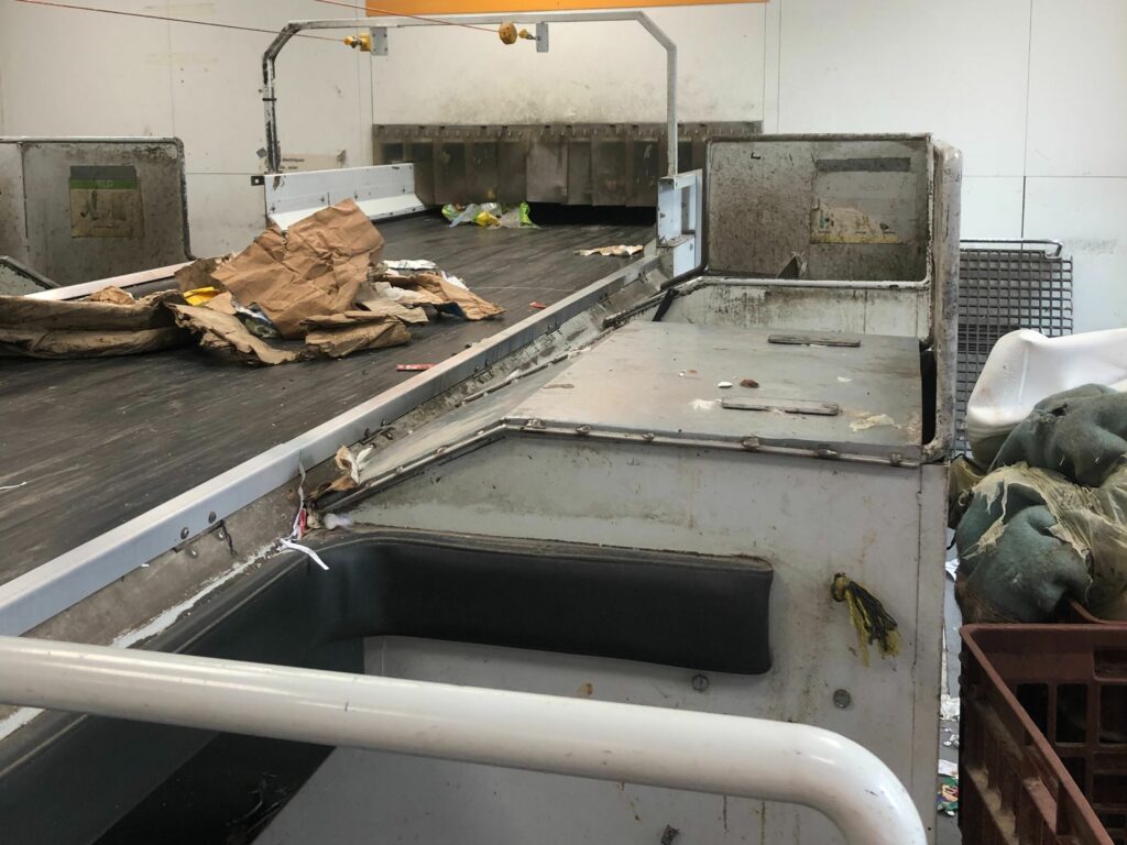 Les déchets sont introduis dans une première machine qui déchire les sacs jaunes pour ensuite les déposer sur un tapis roulant qui alimente la chaîne de tri.
