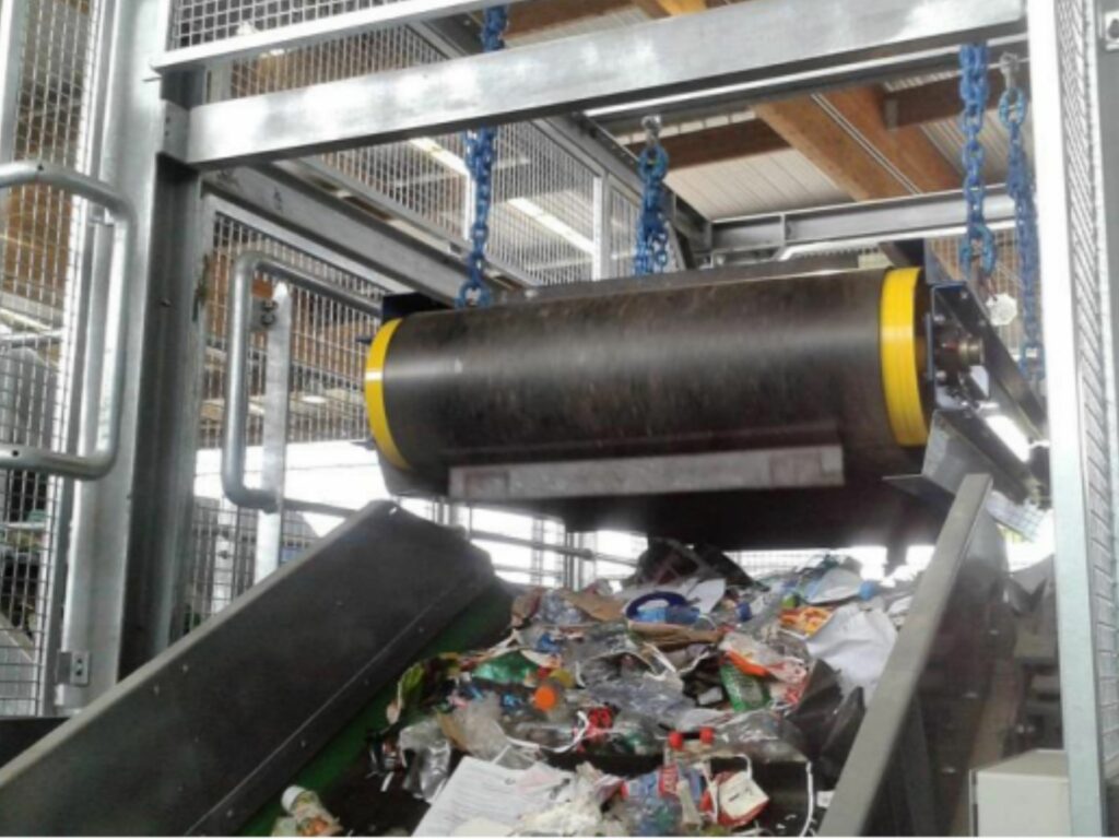Grâce à un aimant tous les objets en acier ou en aluminium sont séparés des autres déchets et seront ensuite compactés.